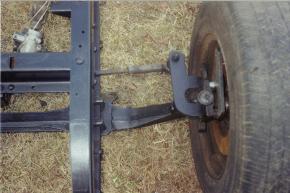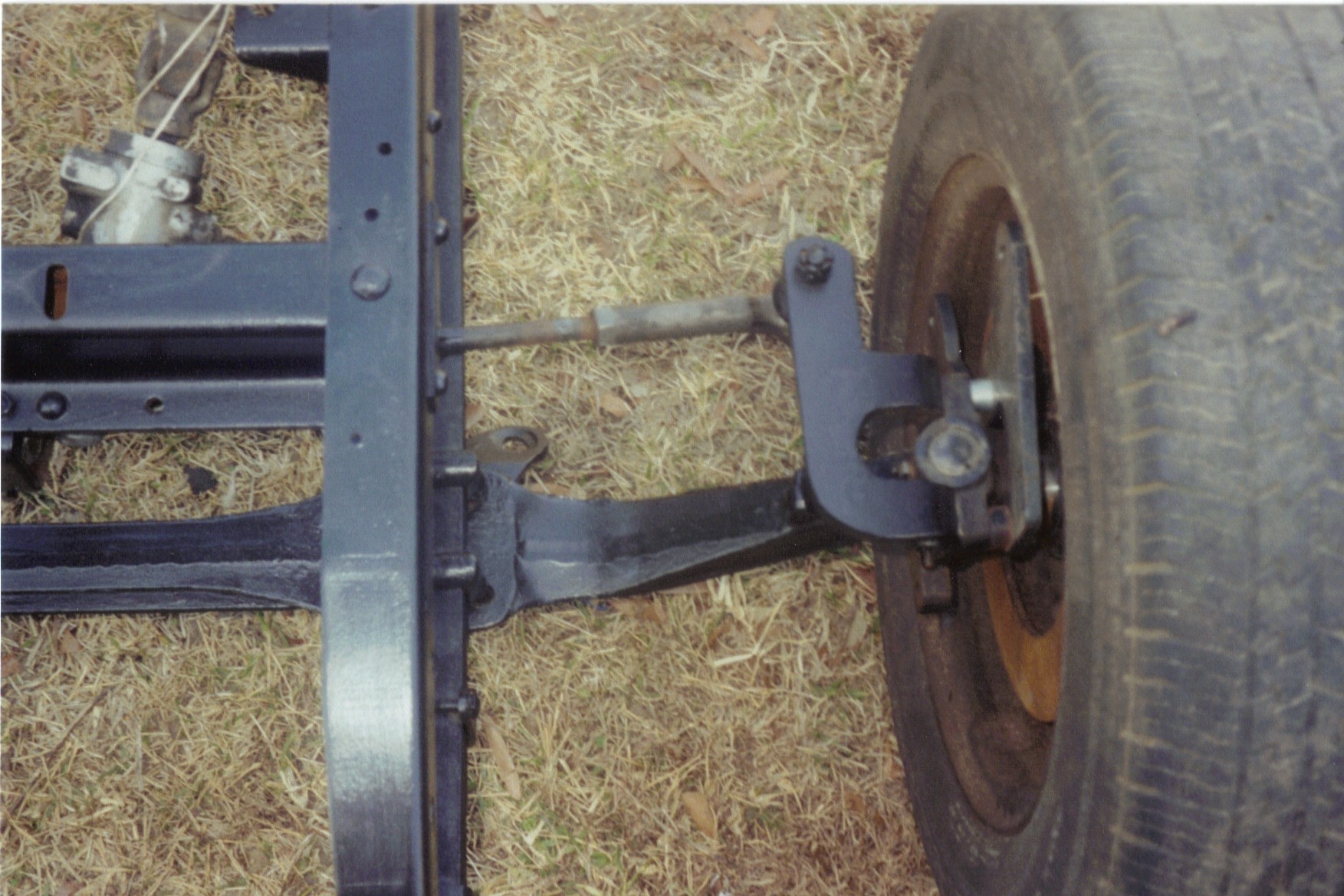 This is the front end with the Dodge Omni rack and pinion unit installed. I had to fab mounts for the rack and also steering arms for the spindles. The tie rods had to be shortened. I also installed a disc brake conversion. The calipers aren’t installed yet. In the middle picture you can see the shock mount on the axle. It all worked out pretty good except for the bumpsteer from the rack being mounted to the crossmember. I fixed that later with a IFS from Fatmans. This was my first attempt at anything like this and there was a lot of trial and error. |
